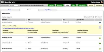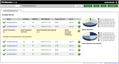 What is CN=Monitor?Directory Server Monitoring application. The idea is to monitor entire small to large scaled deployed directory server environments.Main FeaturesMonitoring cluster/environment availability![]() Verify that all servers within your environment are responding. Verify load balancing and scalability. Monitoring server availability![]() Keep track of uptime, certificates, cache sizes, replication status and schema. Monitoring performance counters![]() Live monitoring to view current load or collect historical events to be proactive and view trends. 15 different types of performance counters supported such as Returned Entries, Returned KiloBytes, Connections and Response Time Advance Query![]() Verify data consistency by querying several server at once or export CSV lists based on a list of attribute values. |
